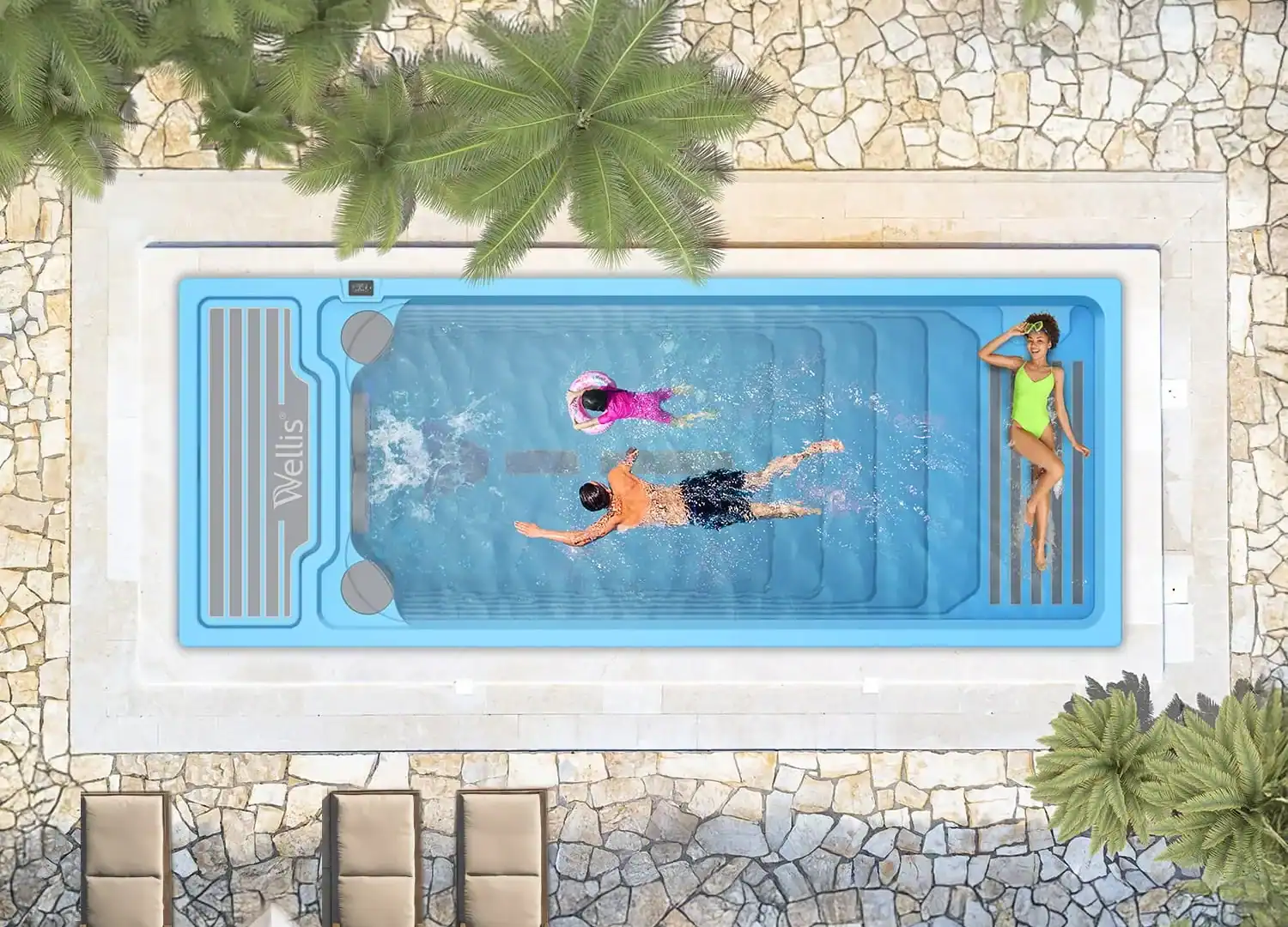 The largest in-ground swimming pool we offer is the Beach Club. This pool offers an infinity swimming area, ideal for fitness and recreation. In addition to its generous swimming zone, it includes a built-in relaxation area with seating for up to 5 people.